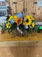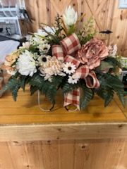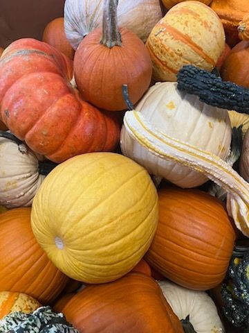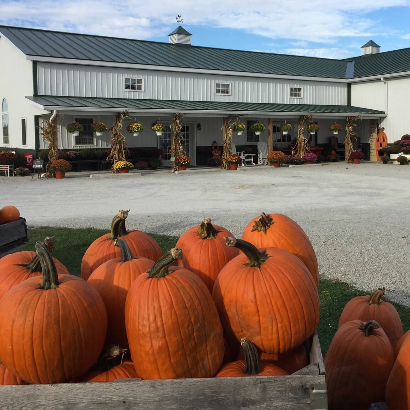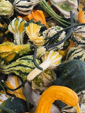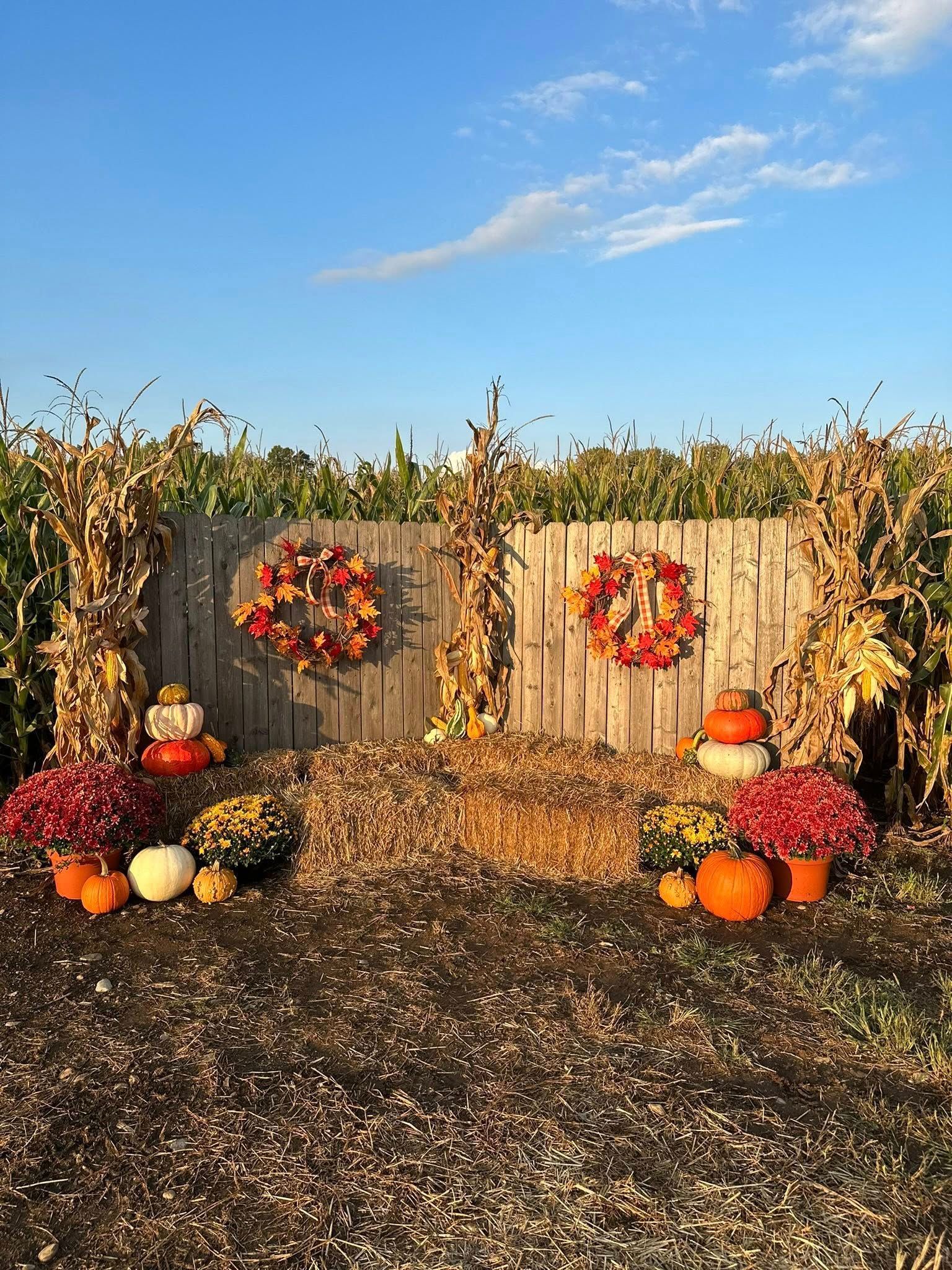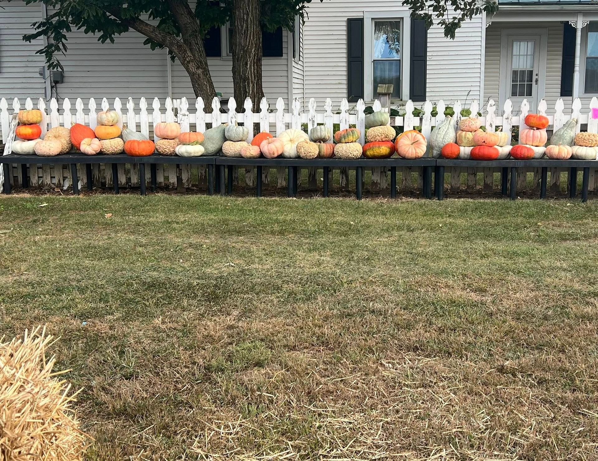 We have all sizes of pumpkins in the fall. Jack-O’-lantern size, pie pumpkins in white and orange, stackable pumpkins, gourds, corn shocks, Indian corn bundles, straw, and lots of farm fall decorations.