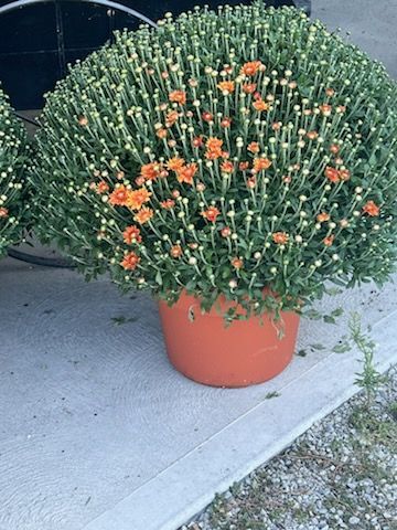 We grow our hardy mums in the fall outside. Our big, hardy mom is usually 36” across. Our small pots are at least 12 inches wide. The mums come in lots of different colors: red, white, bronze, yellow, pink, coral, and orange.